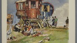 Watercolour painting of families around two Gypsy Traveller wagons. On the reverse side in pencil, "For Mrs Buffey on Gypsies."