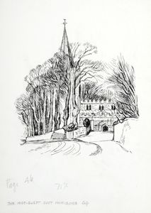 "The Mist-Swept Soft Horizons" (church and stand of trees in gated churchyard). Original drawing prepared for "Poems, Strange Places, Rhymes for Children and Others" by Joan Ingilby, published by the Dalesman Publishing Company Ltd. (1994). Indicated for
